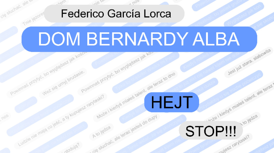 Widowisko przedstawia zagrożenia jakie niesie za sobą hejt oraz czym różni się od plotki. Występ artystów ma za zadanie przestrzec przed treściami jakie umieszczamy w internecie, ponieważ one nie giną i mogą zostać wykorzystane. Spektakl pt. "Dom Bernardy Alba, Hejt Stop!" odbędzie się w piątek 21 stycznia o godz. 19.30 w Teatrze Scena Kotłownia przy ul. Lubiejewskiej 19.