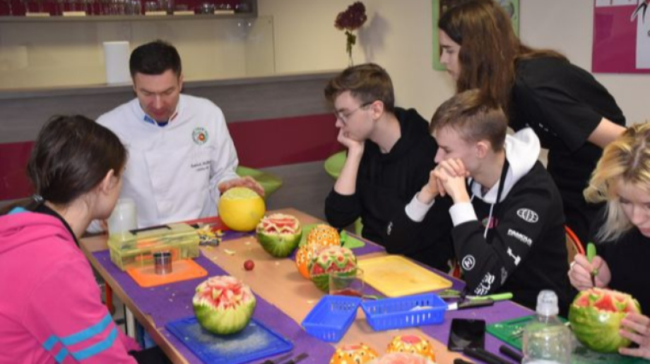 Szkolenie prowadził Dominik Skałbania. Dzięki kursowi uczniowie z ZSCKR w Starym Lubiejewie zdobyli wiedzę na temat sztuki rzeźbienia w owocach i warzywach.