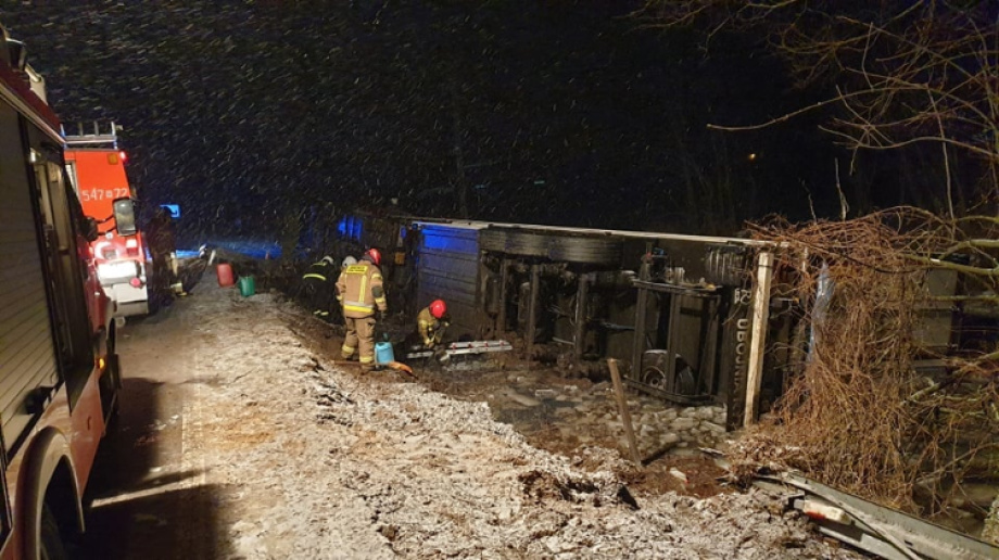 Do zdarzenia doszło w środę 2 lutego ok. godz. 4.00 w miejscowości Zaręby Warchoły, gdzie kierujący samochodem ciężarowym wskutek warunków panujących na drodze zjechał do przydrożnego rowu oraz przewrócił się na prawy bok. Na szczęście nikt nie został poszkodowany.