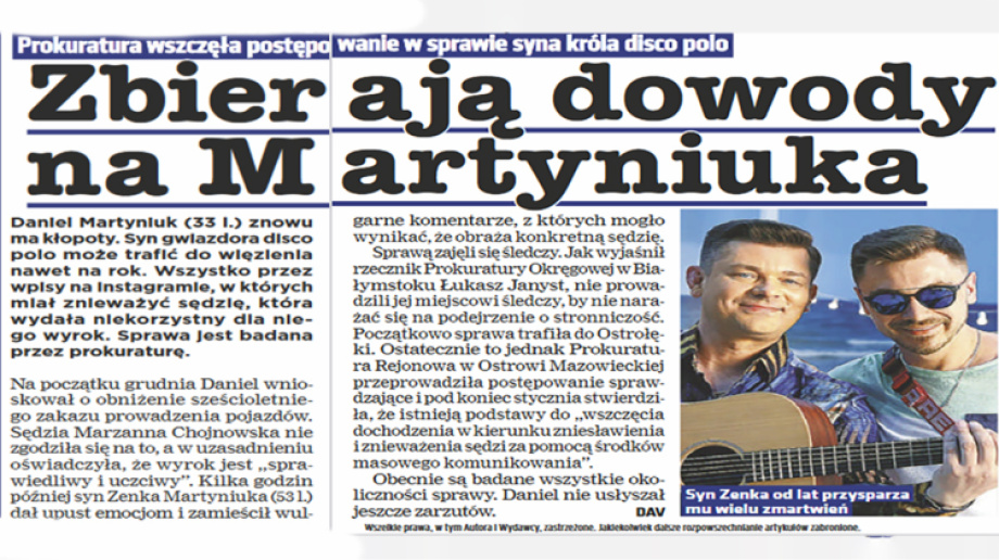 We wtorkowym wydaniu "Super Ekspessu" pojawił się artykuł dotyczący syna Zenka Martyniuka. Z ustaleń dziennikarzy wynika, że to Prokuratura Rejonowa w Ostrowi Mazowieckiej przeprowadziła postępowanie sprawdzające.
