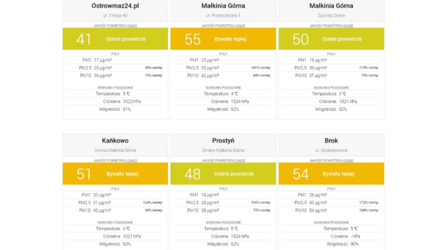 Na podstawie danych przekazywanych przez czujniki obliczany jest ogólny wskaźnik jakości powietrza w europejskiej skali CAQI. Przewidziano w niej wartości od zera do 100. Im mniej punktów, tym lepsza jest jakość powietrza w danej lokalizacji. Gdy wartość przekracza 100 punktów, smog określany jest jako "ekstremalny". Na naszej stronie, pomimo prezentowania danych z różnych czujników, dla każdego pomiaru obliczamy wskaźnik CAQI, dzięki czemu łatwiej porównać jakość powietrza z każdego urządzenia. Oprócz kluczowych wartości do oceny jakości powietrza, takich jak wartości pyłów PM1, PM2.5 i PM10 oraz warunki pogodowe, na stronie znajdziecie także informacje o aktualnej temperaturze, ciśnieniu i wilgotności powietrza. Dane przygotowane zostały w bardzo czytelnej formie. Strona działa na wszystkich urządzeniach: komputerach, tabletach, smartfonach, czytnikach ebooków oraz nowoczesnych telewizorach. To najlepsze miejsce do szybkiego sprawdzenia stanu powietrza w okolicy. Nie trzeba instalować żadnego dodatkowego oprogramowania.