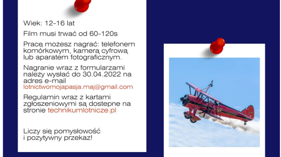 W konkursie "Lotnictwo moja pasja" mogą wziąć udział osoby w wieku od 12 do 16 lat. Wystarczy nagrać telefonem lub kamerą film, na którym zobrazowana będzie pasja do lotnictwa.