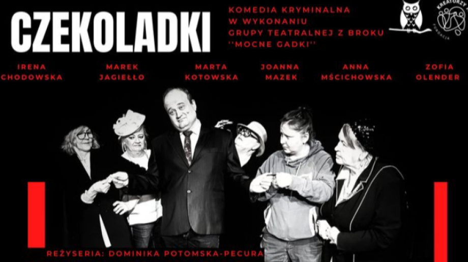Biblioteka Publiczna w Broku zaprasza na premierę spektaklu teatralnego "Czekoladki", która odbędzie się w niedzielę 6 marca o godz. 18.00 na Sali Widowiskowej przy ul. Pułtuskiej 22 w Broku. Spektakl "Czekoladki" to komedia kryminalna.