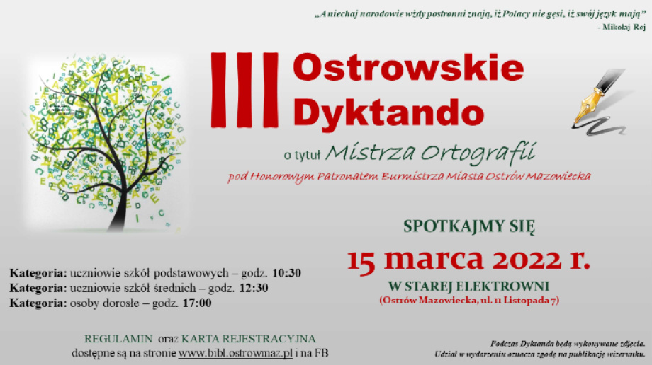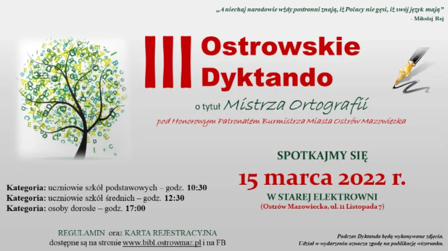 Już 15 marca w Starej Elektrowni przy ul. 11 Listopada 7 w Ostrowi Mazowieckiej odbędzie się III Ostrowskie Dyktando o tytuł Mistrza Ortografii. Konkurs ma na celu promowanie języka ojczystego, a także sprawdzenie znajomości zasad ortografii i interpunkcji polskiej.
