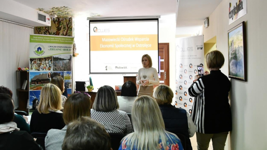 Animator MOWES Łukasz Wachowski przedstawił uczestnikom główne założenia działalności MOWES, a także możliwości współpracy na rzecz lokalnej społeczności. Zapoznał również słuchaczy z zasadami poprawnego sporządzenia oferty na realizację zadania publicznego Województwa Mazowieckiego "Wspieranie rozwoju gospodyń aktywnych społecznie" oraz przybliżył program Mazowsze Lokalnie 2022.