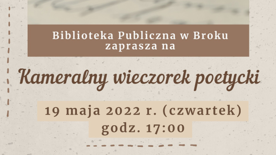 W czwartek 19 maja o godz. 17.00 w Sali widowiskowej w Broku odbędzie się Kameralny wieczorek poetycki. Biblioteka Publiczna w Broku zaprasza wszystkich miłośników poezji. Bedzie to spotkanie z cyklu "Pasje mieszkańców", podczas którego zaprezentują swoją twórczość mieszkańcy Miasta i Gminy Brok.