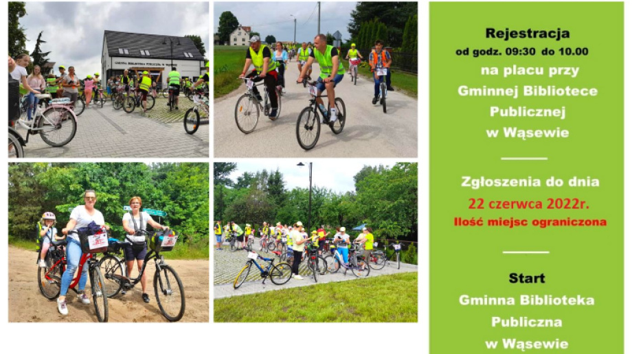 Urząd Gminy oraz Gminna Biblioteka Publiczna w Wąsewie zapraszają na VI Rajd Rowerowy wszystkich miłośników książek i rowerów.