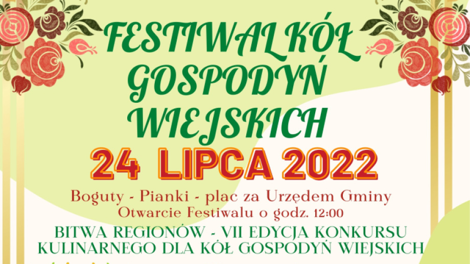 Gmina Boguty-Pianki organizuje Festiwal Kół Gospodyń Wiejskich. Na wydarzeniu odbędzie się piknik z produktem polskim oraz Bitwa Regionów!
