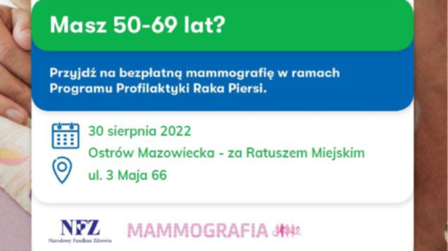 Lux Med Diagnostyka zaprasza na bezpłatne badania, które pozwolą na wykrycie zmian w piersiach na bardzo wczesnym etapie rozwoju, kiedy nie są one wyczuwalne podczas samokontroli piersi lub badań palpacyjnych. Badanie mammograficzne będzie wykonane dla kobiet w wieku od 50 lat do 69 lat i jest finansowane przez NFZ w ramach Programu Profilaktyki Raka Piersi. Mobilna pracownia będzie stacjonowała w Ostrowi Mazowieckiej 30 sierpnia w godz. 10.00 - 16.00 za Ratuszem Miejskim przy ul. 3 Maja 66.