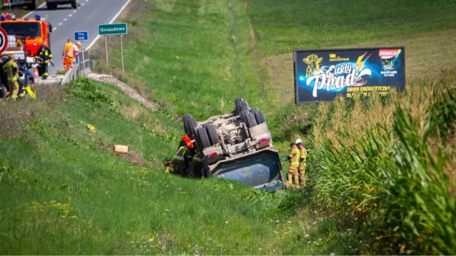W Gniazdowie doszło do zdarzenia drogowego, w wyniku którego samochód ciężarowy zatrzymał się na dachu w rowie.
