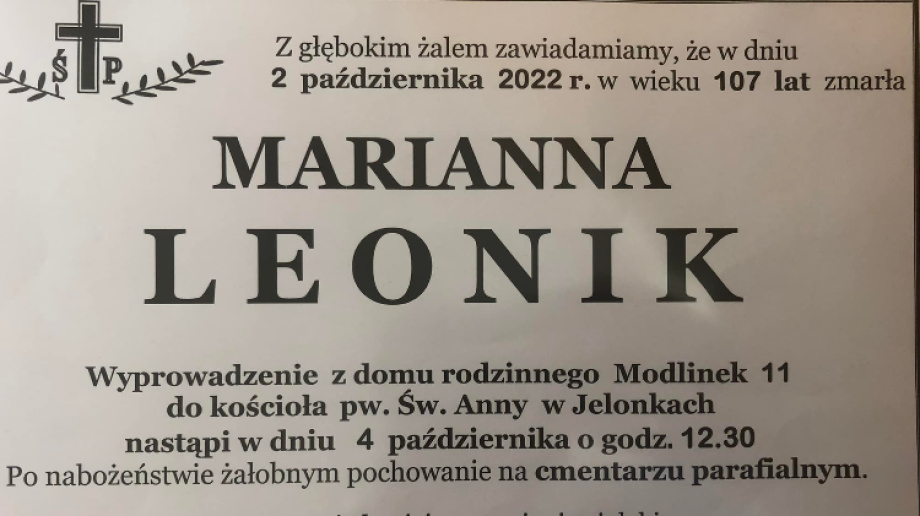 Marianna Leonik odeszła do wieczności w niedzielę 2 października w wieku 107 lat, zamieszkała w miejscowości Modlinek. Wyprowadzenie z domu rodzinnego w miejscowości Modlinek 11 do kościoła pw. Św. Anny w Jelonkach odbyło się 4 października o godz. 12.30.