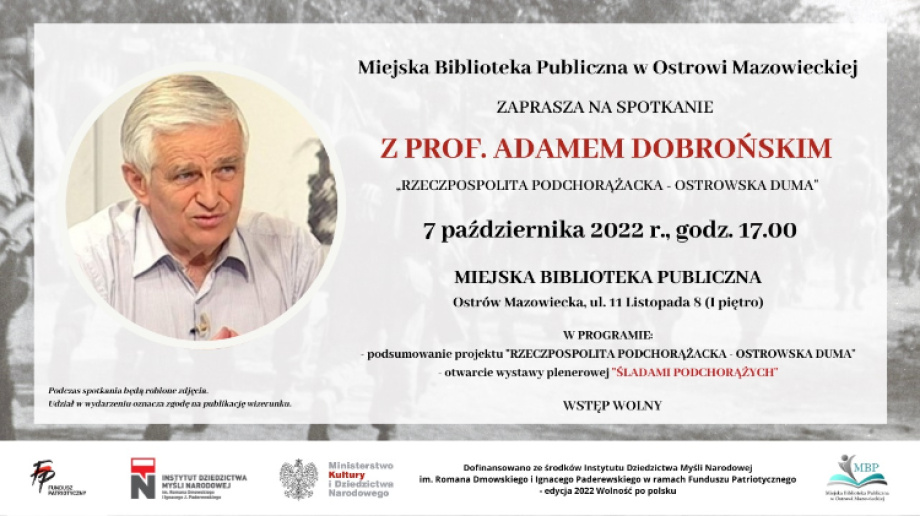 Miejska Biblioteka Publiczna w Ostrowi Mazowieckiej serdecznie zaprasza wszystkich miłośników lokalnej historii i nie tylko na spotkanie z prof. Adamem Dobrońskim.