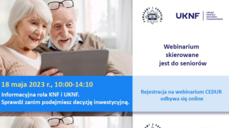 Urząd Komisji Nadzoru Finansowego zaprasza seniorów na serię webinariów organizowanych w ramach projektu edukacyjnego Centrum Edukacji dla Uczestników Rynku. Wspólnie z Komendą Główną Policji oraz Ministerstwem Rodziny i Polityki Społecznej, UKNF stawia sobie za cel zwiększenie świadomości seniorów na temat rynku finansowego i minimalizację ryzyka związanego z inwestycjami.