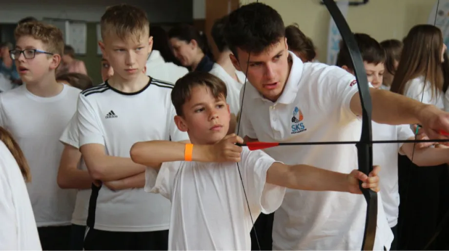Kolejnym punktem programu była rozgrzewka, w której uczniowie mieli okazję przygotować się do dalszych sportowych zmagań, a po krótkim czasie nadszedł moment, na który wszyscy uczestnicy czekali z niecierpliwością. Uczniowie zostali podzieleni na grupy, co pozwoliło na efektywne zorganizowanie dalszej części spotkania. Każda z grup miała możliwość przejścia przez stacje z różnorodnymi ćwiczeniami. Były to m.in. ćwiczenia na skoczność i szybkość, strzelanie z łuku, oraz zadania związane z koncentracją i współpracą. Wydarzenie stanowiło nie tylko wyzwanie, ale również wspaniałą sportową zabawę dla wszystkich uczestników.