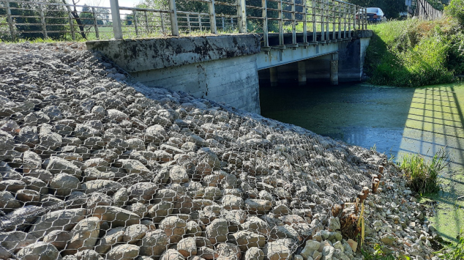 Prace naprawcze polegały na usunięciu warstwy humusu oraz krzaków, wykonaniu skarpy z kruszywa naturalnego, ułożeniu geowłókniny oraz materacy gabionowych o gr 20 cm. W wyniku prac skarpa jest dobrze zabezpieczona, co znacznie zwiększyło bezpieczeństwo w ruchu drogowym.