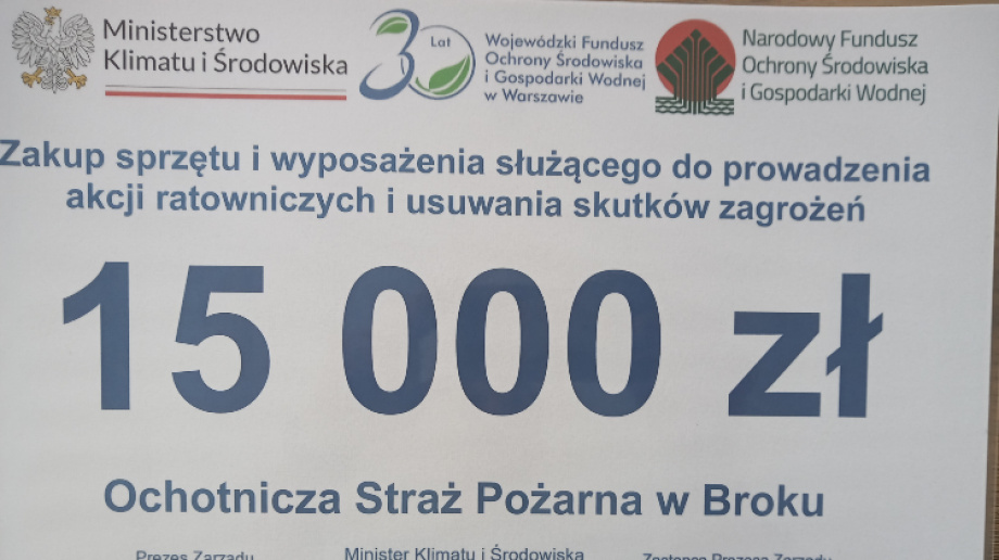 Ochotnicza Straż Pożarna w Broku otrzymała wsparcie finansowe w wysokości 24 800 zł z Wojewódzkiego Funduszu Ochrony Środowiska i Gospodarki Wodnej w Warszawie oraz Funduszu Składkowego Ubezpieczenia Społecznego Rolników. Dotacje zostaną przeznaczone na zakup sprzętu i wyposażenia służącego do prowadzenia akcji ratowniczych i usuwania skutków zagrożeń.