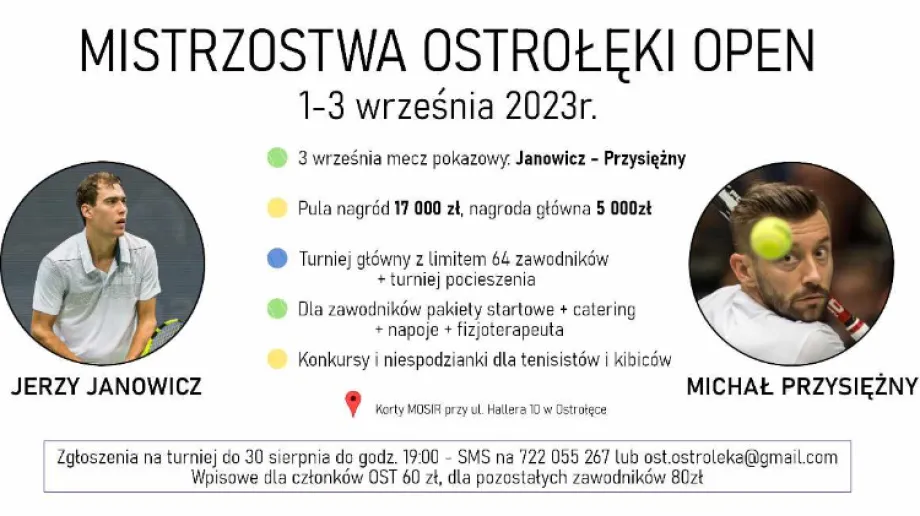 Ostrołęckie Stowarzyszenie Tenisowe wraz z Urzędem Miasta Ostrołęki zapraszają do udziału oraz do kibicowania w największym turniejm tenisowy w histori naszego regionu! Turniej tenisowy na 650-lecie miasta Ostrołęki rozpocznie się od piątkowych meczów 1 rundy. W sobotę zawodnicy będą walczyć o awans do fazy finałowej oraz w turnieju pocieszenia. Niedziela to mecze decydujące o zwycięstwie w całym turnieju oraz nie lada gratka dla wszystkich kibiców sportu  - mecz pokazowy: Jerzy Janowicz vs Michał Przysiężny.
