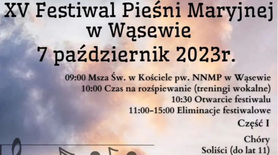 Stowarzyszenie Ziemia Wąsewska, Urząd Gminy Wąsewo i Parafia pw. Narodzenia NMP w Wąsewie zapraszają na XV Festiwal Pieśni Maryjnej w Wąsewie.