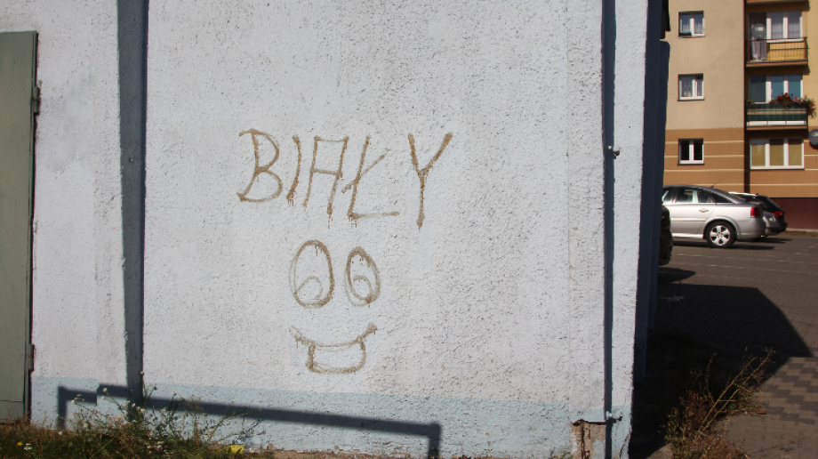 Odpowiedź: Graffiti na małym, białym budynku, który stoi obok siedziby MDK.