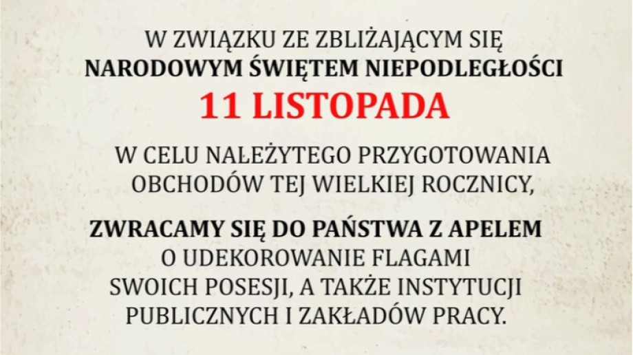 Urząd Miasta w Ostrowi Mazowieckiej apeluje do wszystkich mieszkańców, by udekorować swoje posesje i zakłady pracy flagą w celu należytego świętowania Narodowego Święta Niepodległości 11 listopada.