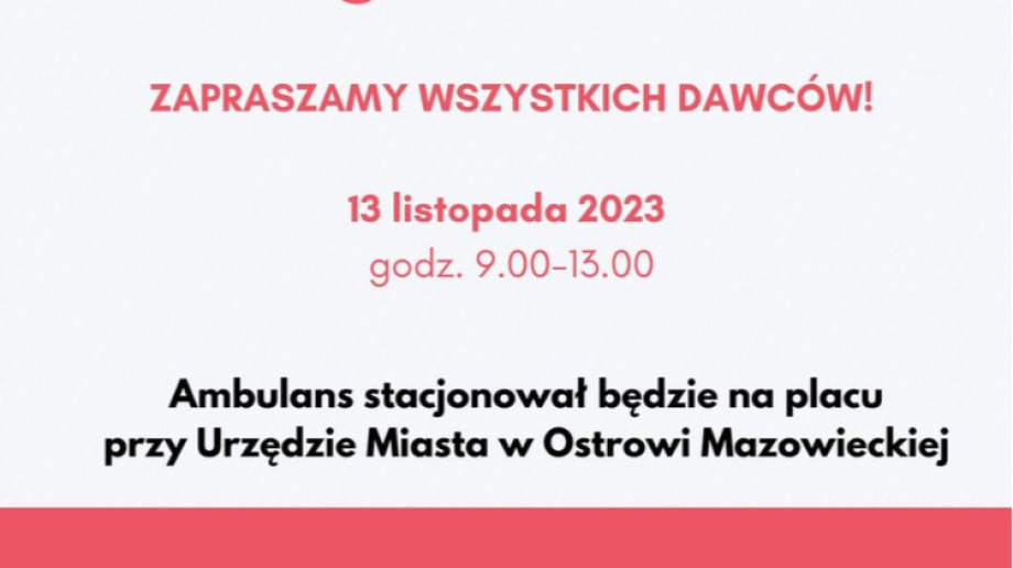 W poniedziałek, 13 listopada 2023 roku, przy Ratuszu Miejskim w Ostrowi Mazowieckiej odbywa się akcja poboru krwi. Do godz. 13.00 można oddać krew w ambulansie Regionalnego Centrum Krwiodawstwa i Krwiolecznictwa.