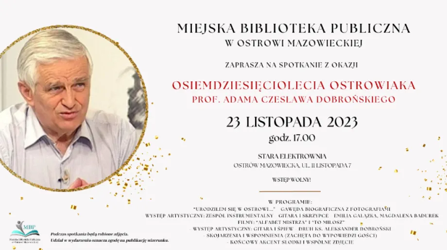 Miejska Biblioteka Publiczna w Ostrowi Mazowieckiej zaprasza na wspólne świętowanie 80 urodzin prof. Adama Czesława Dobrońskiego.