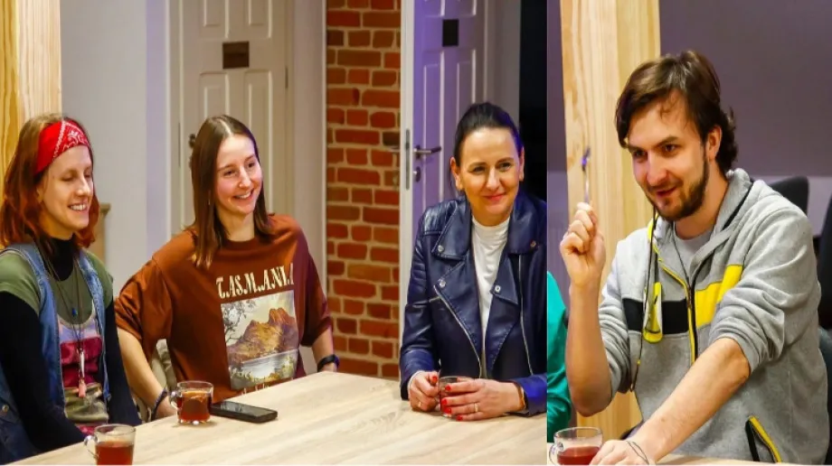 Rozpoczęto od spraw wolontariatu, gdzie kolejny raz w luźny lecz skrupulatny sposób ustalono nowe cele i zadania przy filiżance herbaty. Następnie rozpoczęła się rozmowa z artystą. I podobnie do typowych spotkań wolontariatu panowała dość zrelaksowana, miła i przyjazna atmosfera - w końcu Pan Kacper pochodzi z naszych okolic i nawet ukończył dwie szkoły w naszym mieście. Można więc powiedzieć, że byli tam "sami swoi".
