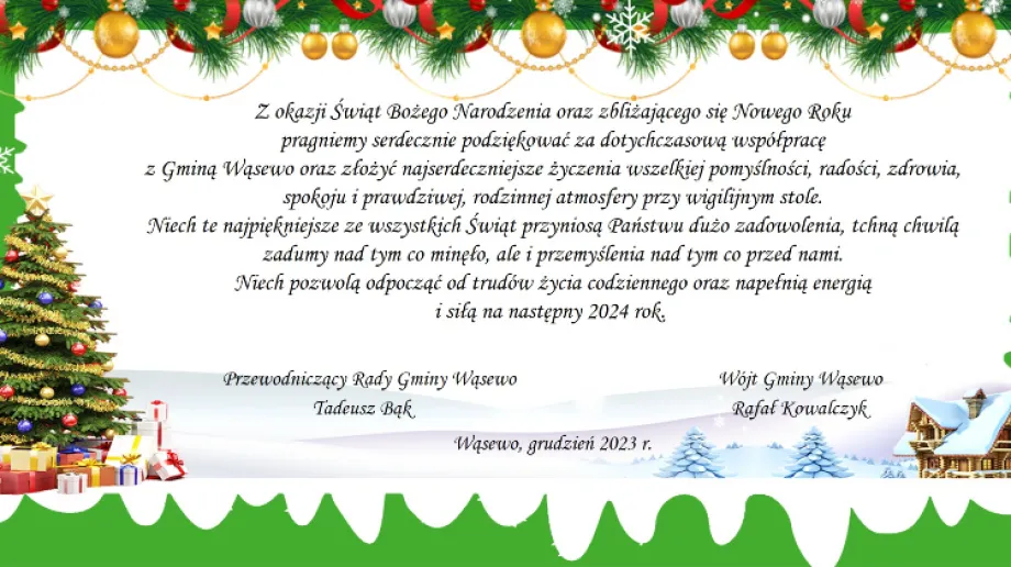 Z okazji Świąt Bożego Narodzenia oraz zbliżającego się Nowego Roku pragniemy serdecznie podziękować za dotychczasową współpracę z Gminą Wąsewo, oraz złożyć najserdeczniejsze życzenia wszelkiej pomyślności, radości, zdrowia, spokoju i prawdziwej rodzinnej atmosfery przy wigilijnym stole.