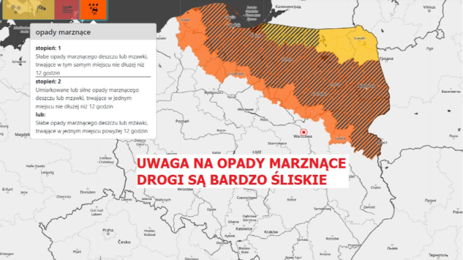 Na północy Polski panują niebezpieczne warunki pogodowe. W wielu miejscach występują i w kolejnych godzinach nadal będą prognozowane słabe opady marznącego deszczu powodujące gołoledź.