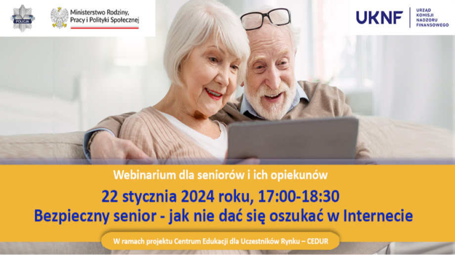 Urząd Komisji Nadzoru Finansowego zaprasza seniorów i ich opiekunów na webinarium "Bezpieczny senior - jak nie dać się oszukać w Internecie". Spotkanie online odbędzie się 22 stycznia 2024 r. (17:00-18:30).