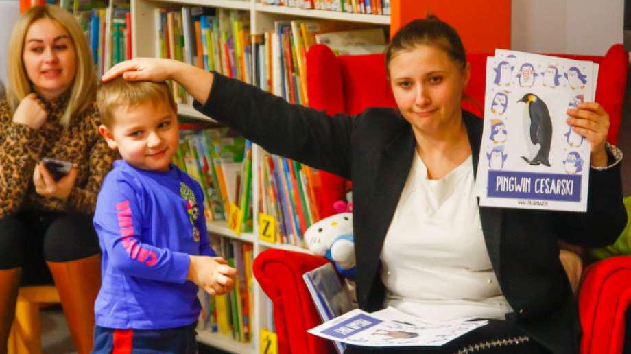 Następnie Pani Jagiełło-Socha wyjęła kartki przedstawiające sylwetki różnego rodzaju pingwinów podpisanych ich nazwami. Pokazując dzieciom ozdobione w pingwinie ramki różne gatunki tych nielotów opowiedziała zgromadzonym co nieco o każdym z nich, czasami używając nakreślających odpowiedni obraz ptaka w wyobraźni klubowiczów przykładów. Zaraz po tym, przebrana w czarno-biały strój Pani Bibliotekarka rozłożyła przed dziećmi odwrócone kartki. Na zmianę wybierały one kartkę, którą potem mogły dać swojemu opiekunowi lub Pani Prowadzącej do przeczytania - były to Pingwinie Ciekawostki. Dzięki tym punktom programu mali klubowicze dowiedzieli się więcej o tym lubiącym chłód ptaku.