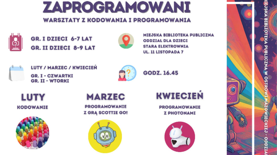 Biblioteka Publiczna w Ostrowi Mazowieckiej zaprasza dzieci w wieku od 6 do 9 lat na nowe zajęcia z kodowania. Zajęcia będą odbywać się w oddziale dla dzieci w Starej Elektrowni, przy ul. 11 Listopada 7, w każdy czwartek i wtorek o godz. 16.45.