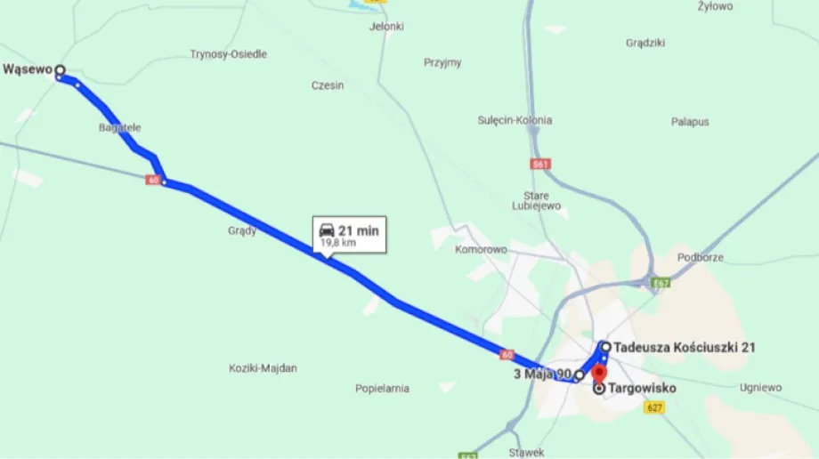 Mapa przejazdu rolników z Wąsewa do Ostrowi Mazowieckiej. Początek protestu zaplanowano na godz. 10.00: