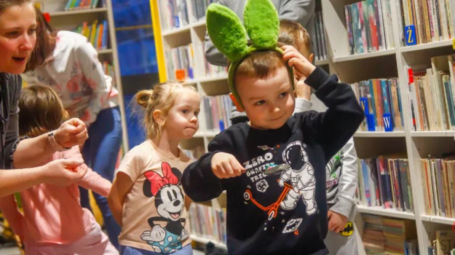 Pani Justyna Jagiełło-Socha, której za przebranie posłużyły tym razem zielone, zajęcze uszy, rozpoczęła jak zwykle od przywitania wszystkich gości i przeczytania im książeczki - w tym wypadku nawet dwóch krótkich dzieł literatury dziecięcej. Były to "Gdzie jest baranek?" oraz "Wielkanocny baranek", które opowiadały o tytułowych bohaterach i ich przygodach. Często pokazywała młodym słuchającym też kolorowe obrazki przedstawiające akcję opowiadań, zadając im przy okazji różne rozruszające młode umysły pytania na temat dotychczas przeczytanych fragmentów. Klubowicze chętnie i z entuzjazmem na nie odpowiadali.