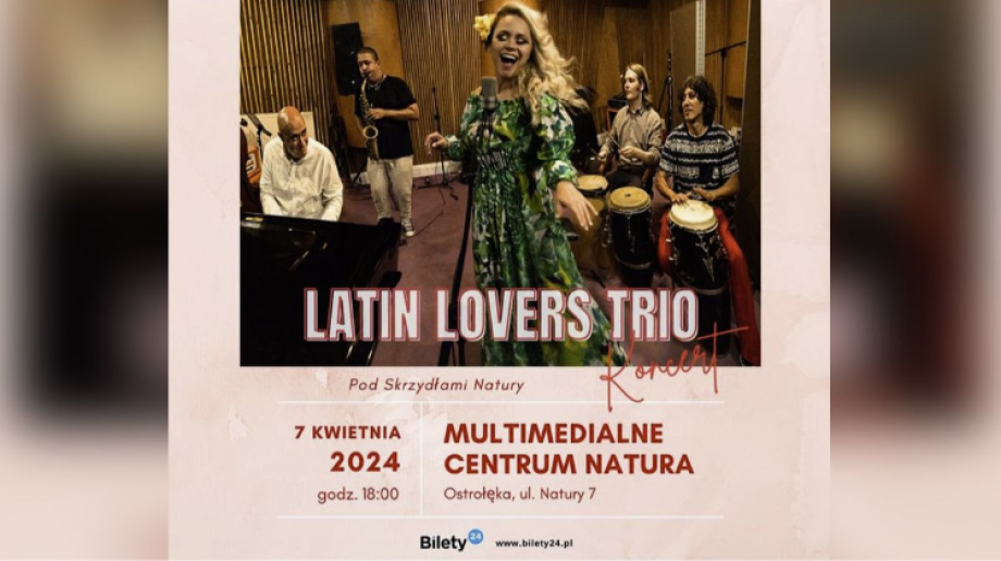 Zapraszamy Państwa na muzyczną ucztę w stylu Latin, na scenie wystąpi Latin Lovers Trio, 7 kwietnia 2024 o godz. 18.00 w Multimedialnym Centrum Natura, Ostrołęka, ul. Natury 7.