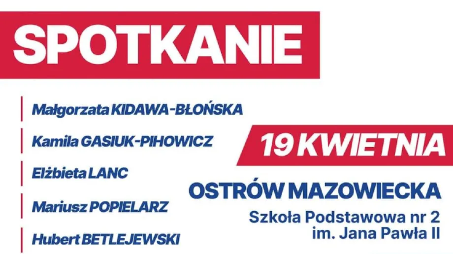 19 kwietnia o godzinie 18.00 w Szkole Podstawowej nr 2 im. Jana Pawła II w Ostrowi Mazowieckiej odbędzie się ważne spotkanie otwarte dla wszystkich mieszkańców miasta. Celem spotkania jest podsumowanie kampanii wyborczej przed drugą turą wyborów na Burmistrza Miasta Ostrów Mazowiecka.
