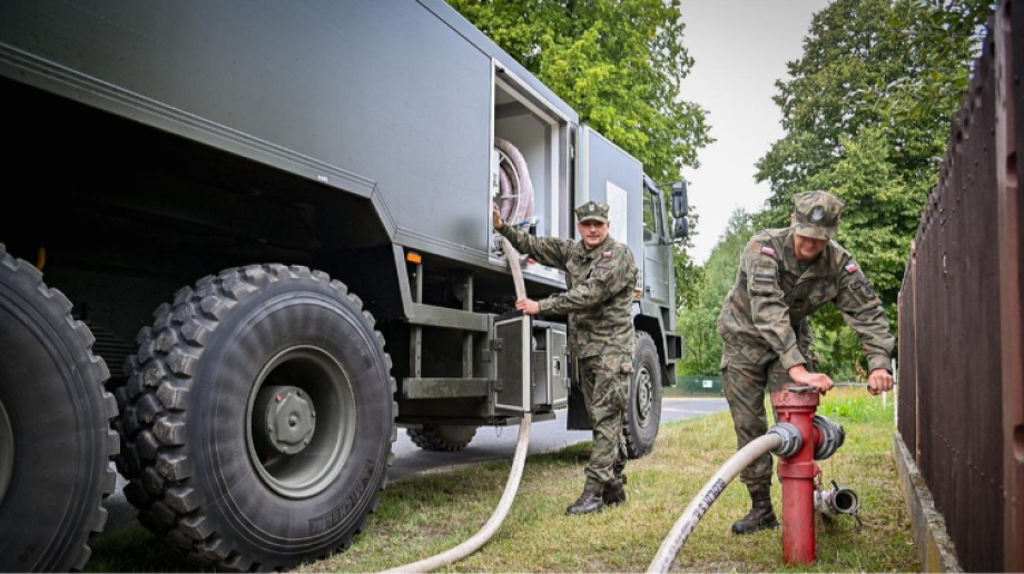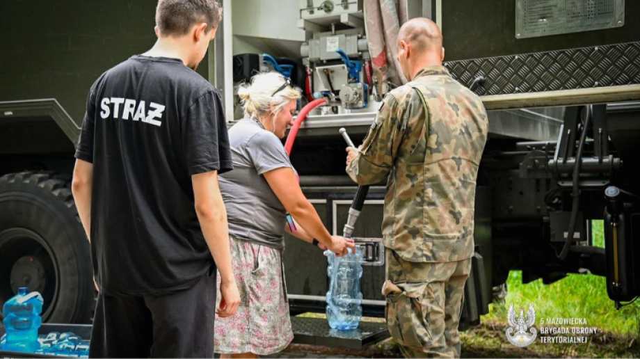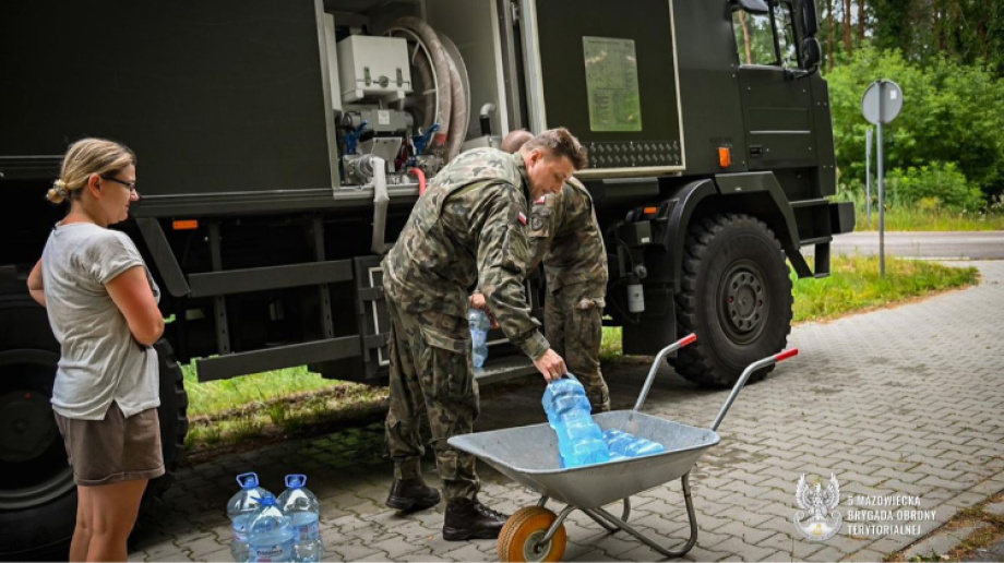 Żołnierze 5 Mazowieckiej Brygady Obrony Terytorialnej dostarczają wodę mieszkańcom Broku w powiecie ostrowskim, którzy w wyniku skażenia miejscowego wodociągu zostali pozbawieni dostępu do bieżącej wody.