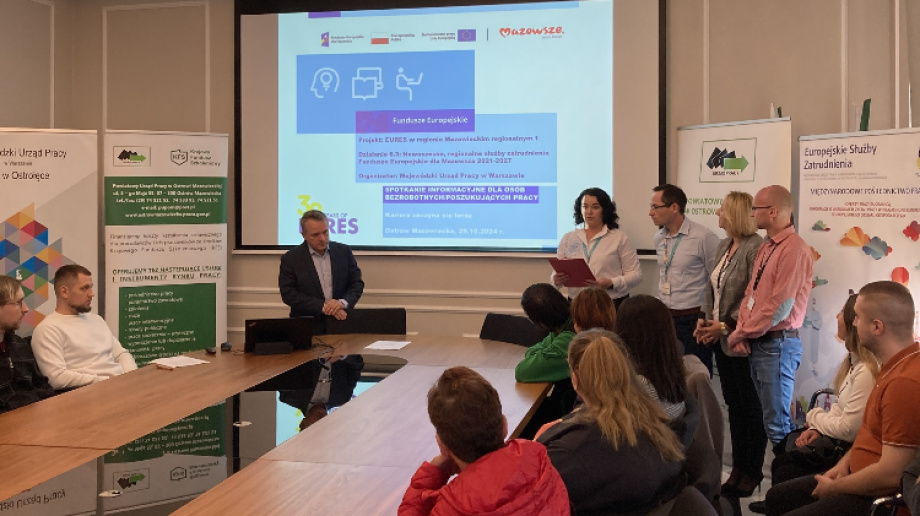 29 października w Starostwie Powiatowym w Ostrowi Mazowieckiej odbyło się spotkanie skierowane do osób bezrobotnych i poszukujących pracy. Uczestnicy mogli zapoznać się z szeroką ofertą usług i narzędzi wspierających rozwój kariery, a także zdobyć wiedzę na temat bezpiecznego poszukiwania pracy za granicą dzięki sieci EURES. Jedną z dodatkowych atrakcji była możliwość wykonania profesjonalnego zdjęcia do CV, co z pewnością stanowiło istotną korzyść dla osób przygotowujących się do aplikacji na rynku pracy.