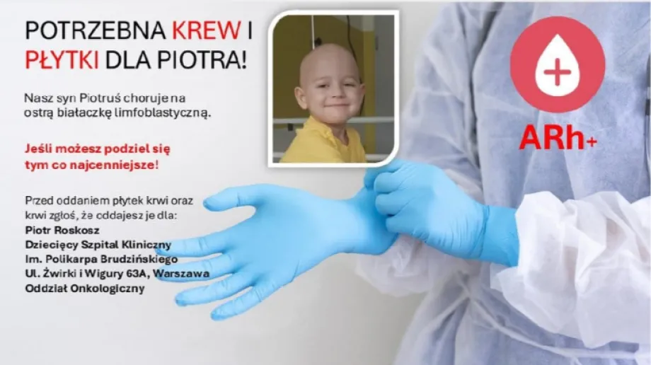 Piotruś, mieszkaniec powiatu ostrowskiego, zmaga się z ostrą białaczką limfoblastyczną. Każdy, kto posiada grupę krwi ARh+, może pomóc, oddając krew lub płytki, które są niezbędne do jego leczenia.