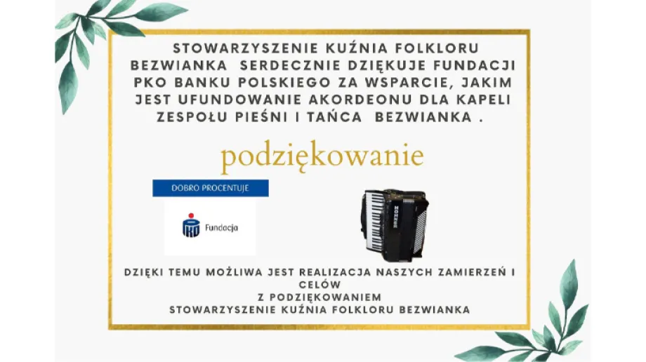 Stowarzyszenie Kuźnia Folkloru Bezwianka serdecznie dziękuje Fundacji PKO Banku Polskiego za wsparcie, jakim jest ufundowanie akordeonu dla kapeli Zespołu Pieśni i Tańca Bezwianka.