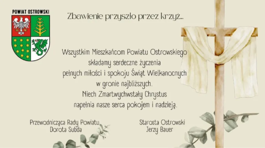 Wszystkim Mieszkańcom powiatu ostrowskiego składamy serdeczne życzenia pełnych miłości i spokoju Świąt Wielkanocnych w gronie najbliższych.