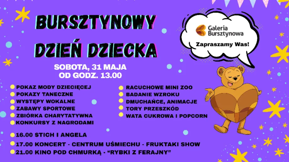 Nieodłącznym elementem naszego święta będzie obecność Misia Bursztynka, z którym dzieci będą mogły zrobić sobie pamiątkowe zdjęcie. Towarzyszyć mu będą również jego goście – Stich i Angela.