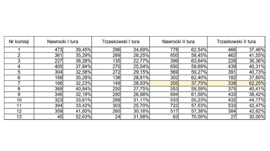 W pierwszej turze w tej komisji Karol Nawrocki zdobył 166 głosów (32,23 proc.), a Rafał Trzaskowski 149 głosów (28,93 proc.). Wynik Trzaskowskiego w komisji nr 7 niczym szczególnym się nie wyróżniał – w czterech komisjach w Ostrowi Mazowieckiej miał wyższy wynik procentowy, a w ośmiu niższy. Jednak druga tura przyniosła ogromną niespodziankę. Zaznaczamy, że nie posiadamy informacji o jakichkolwiek nieprawidłowościach. Opieramy się jedynie na oficjalnych danych Państwowej Komisji Wyborczej.