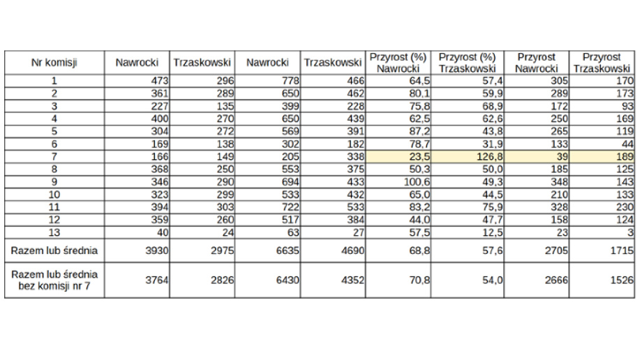 W porównaniu z pierwszą turą Rafałowi Trzaskowskiemu przybyło aż 189 głosów (wzrost o 126,8 proc.), natomiast Karolowi Nawrockiemu zaledwie 39 głosów (wzrost o 23,5 proc.). Dla porównania średni przyrost procentowy dla całego miasta (bez komisji nr 7) wyniósł dla Nawrockiego 70,8 proc., a dla Trzaskowskiego 54,0 proc.