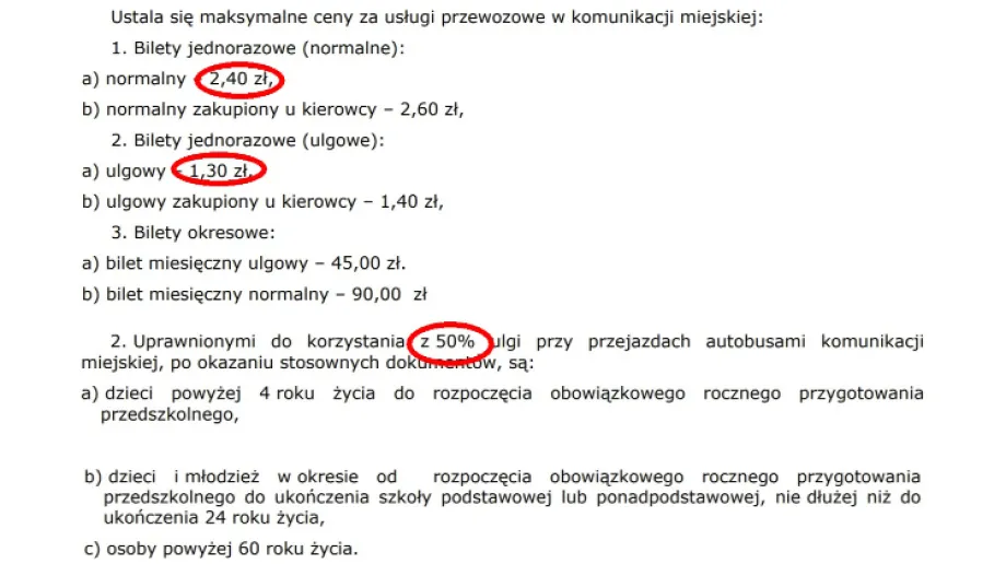 Projekt zawiera jednak nieścisłość. Cena biletu normalnego wynosi 2,40 zł, więc przy zastosowaniu 50-procentowej ulgi cena powinna wynosić dokładnie 1,20 zł. W projekcie cena biletu ulgowego została jednak ustalona na obecnym poziomie 1,30 zł, co wskazuje na potencjalny błąd. Radni mogą zdecydować się na korektę tej ceny do dokładnie 50 procent (1,20 zł) lub pozostawić cenę ulgowego biletu na obecnym poziomie 1,30 zł, przy czym wówczas ulga nie wyniesie dokładnie 50 procent.