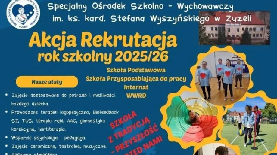 Specjalny Ośrodek Szkolno-Wychowawczy im. ks. kard. Stefana Wyszyńskiego w Zuzeli rozpoczął rekrutację na rok szkolny 2025/2026. Placówka oferuje edukację na poziomie szkoły podstawowej i szkoły przysposabiającej do pracy, a także możliwość zamieszkania w internacie.