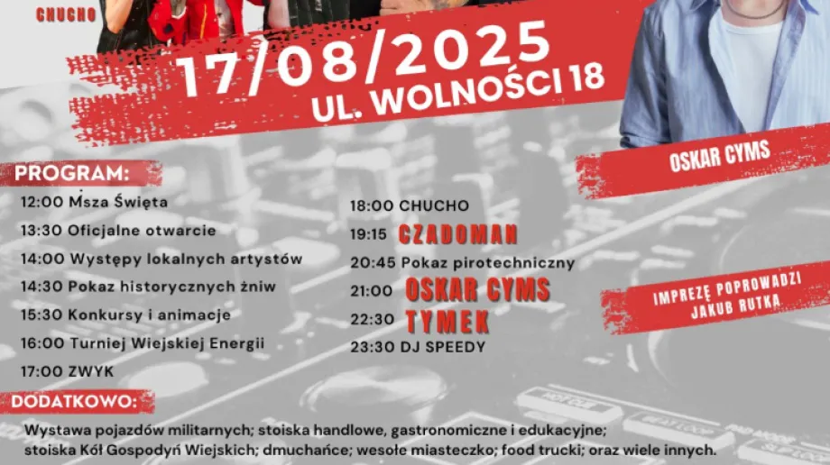 Dodatkowe atrakcje: wystawa pojazdów militarnych, stoiska handlowe, gastronomiczne i edukacyjne, prezentacje Kół Gospodyń Wiejskich, dmuchańce, wesołe miasteczko, food trucki i wiele innych atrakcji!