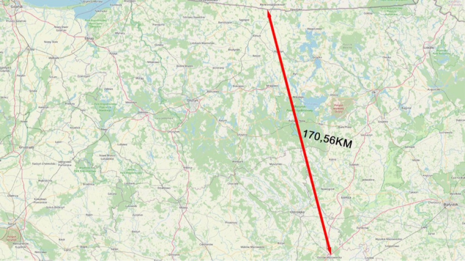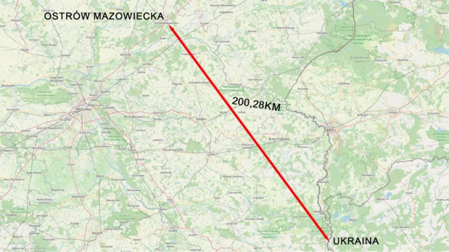 Najbliżej Ostrowi Mazowieckiej dron spadł w miejscowości Korytnica w powiecie węgrowskim. To sąsiedni powiat, graniczący bezpośrednio z powiatem ostrowskim. Odległość między Korytnicą a Ostrowią Mazowiecką to około 50 kilometrów.