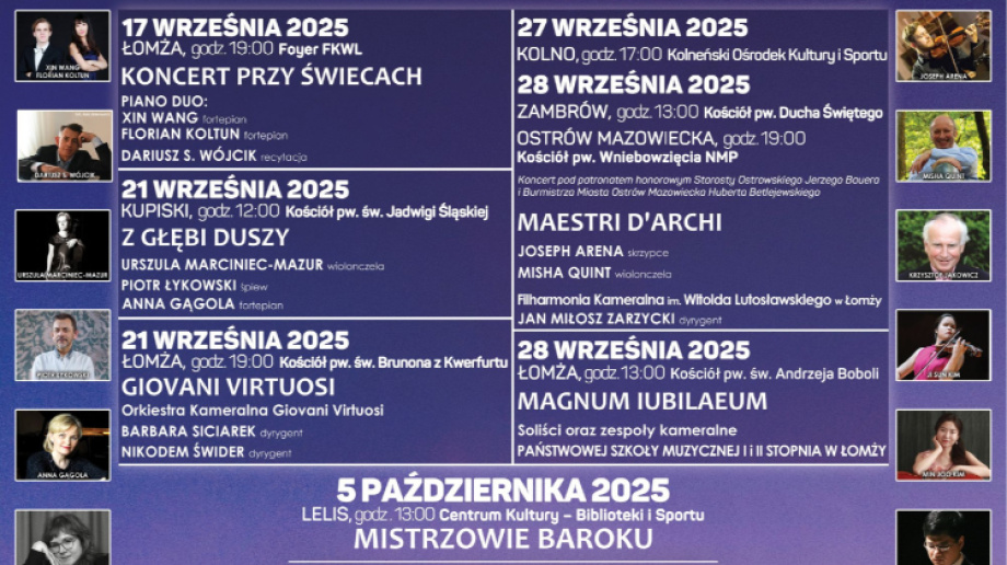 Podczas koncertu przed publicznością wystąpią wybitni muzycy: Joseph Arena na skrzypcach oraz Misha Quint na wiolonczeli. Orkiestrą dyrygować będzie Jan Miłosz Zarzycki, a na scenie zaprezentuje się również Filharmonia Kameralna im. Witolda Lutosławskiego w Łomży.