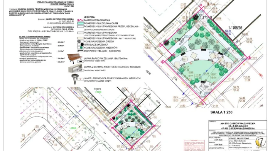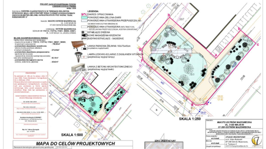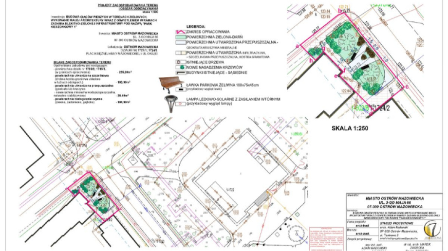 Poza tym zaplanowaliśmy budowę czterech parków kieszonkowych. W skład infrastruktury wejdzie mała architektura: ławki, kosze na śmieci, lampy solarne LED, tereny zielone: nasadzenia drzew, krzewów, trawniki i roślinność ozdobna: byliny, rośliny cebulkowe, nawierzchnie komunikacyjne: ciągi piesze wykonane z materiałów przepuszczalnych, ogrody deszczowe.